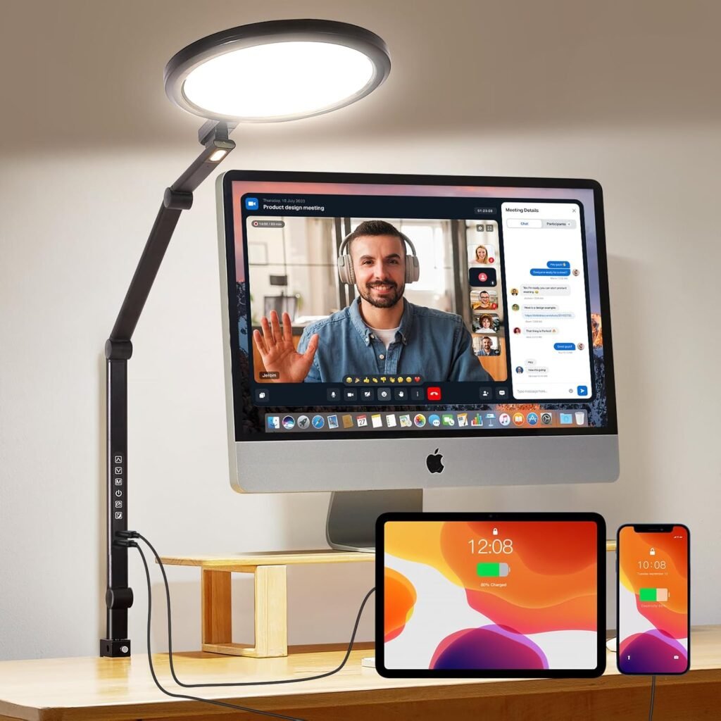 LIFENSGOLER Video Conference Lighting for Computer, Video Recording, Zoom Meeting,Webcam,18W LED Desk Ring Light with Clamp, Adjustable Brightness & Color,Dual USB Charging,Swing Arm, CRI >97