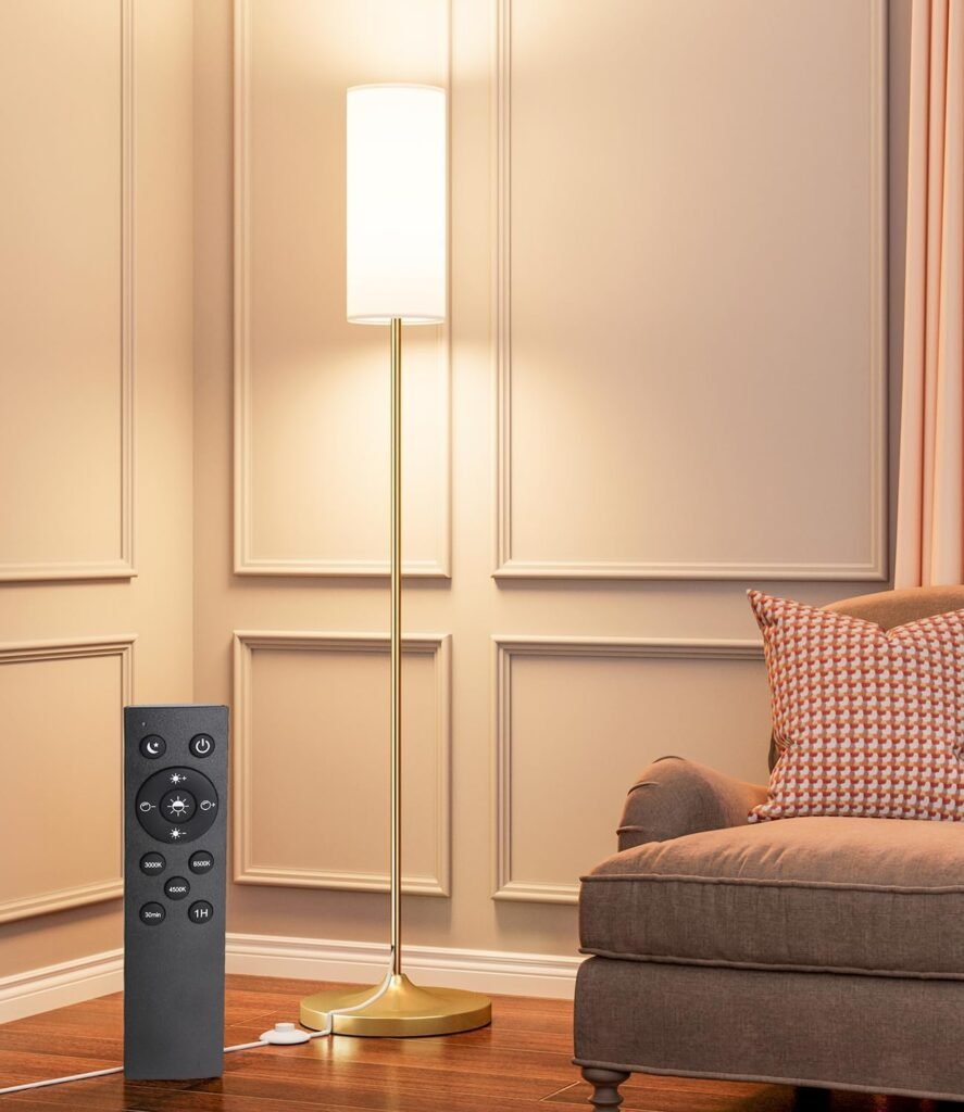 luckystyle LED Floor Lamp for Living Room, Dimmable Standing Lamps with Foot Switch,Remote Custom Color Temperature Gold Pole Lamp with Lampshade,12W Led Bulb Tall Lamps for Bedroom Office Kid Room