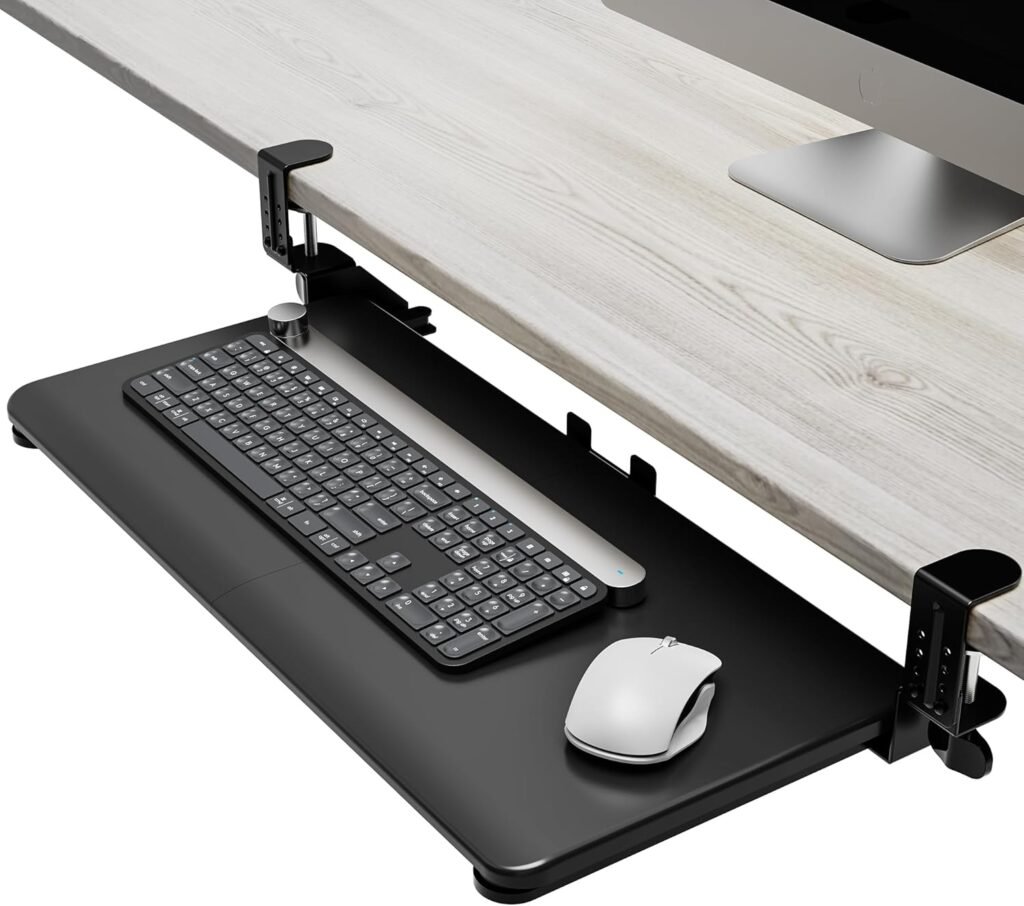 PiomuDek Keyboard Tray Under Desk Slide, 25.6″(30” Including Clamps) x 11.8″ Height Adjustable Slide-Out Keyboard Drawer with C Clamp, Ergonomic Pull Out Platform Computer Drawer for Typing, Black