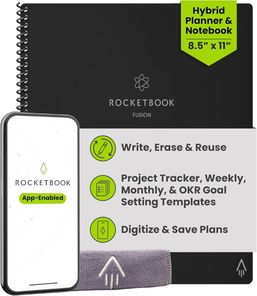 Rocketbook Fusion Hybrid Reusable Planner and Notebook in One, Additional Blank Pages, Goal and Project Tracker, Undated Planner, Letter Size 8.5×11, Black (Pack of 1)