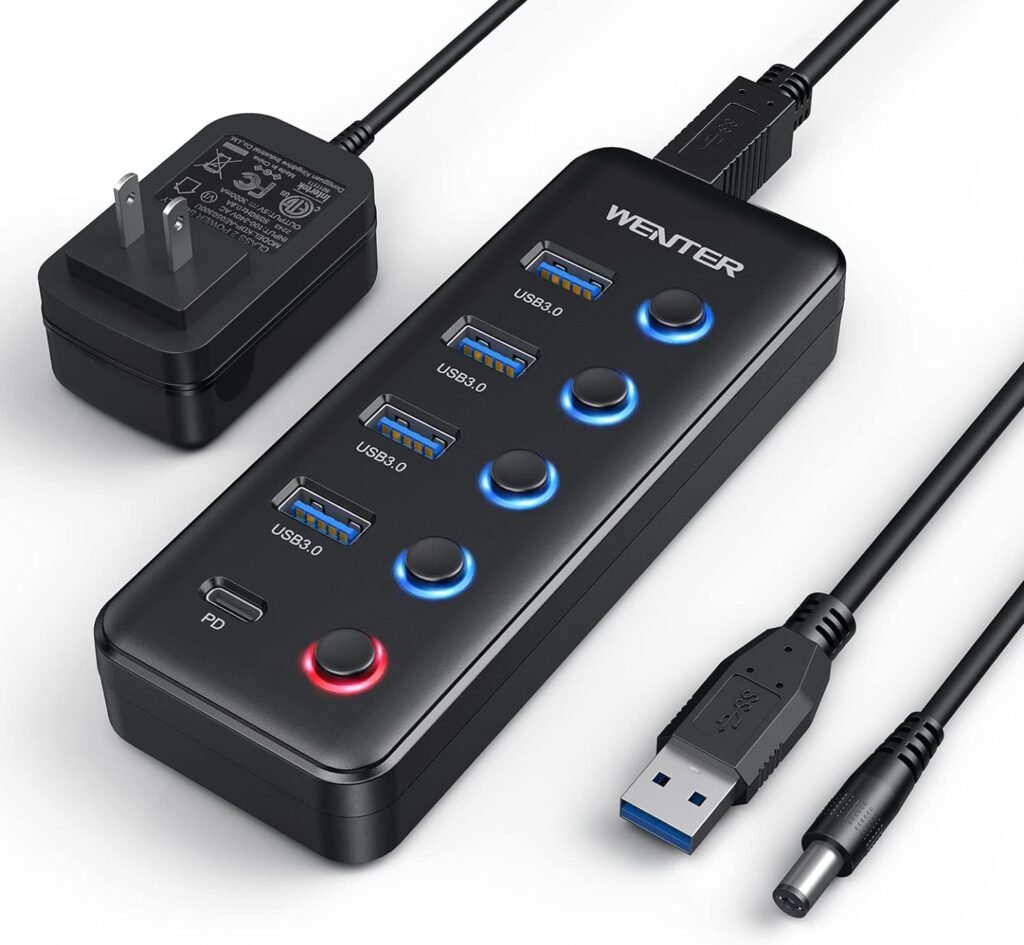 Powered USB 3.0 Hub, Wenter 5-Port USB Hub Splitter (4 Faster Data Transfer Ports+ 1 Type-C Charging Ports) with Individual LED On/Off Switches, USB Hub 3.0 Powered with Power Adapter for Mac, PC