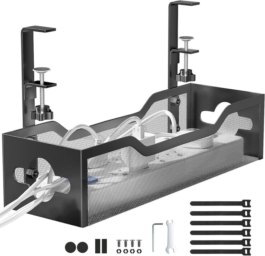 Under Desk Cable Management Tray No Drill, Metal Mesh Cable Management Under Desk with Clamp Mount, 2 Hole Cable Tray with Wire Management and Cord Organizer for Home Office Standing Desk