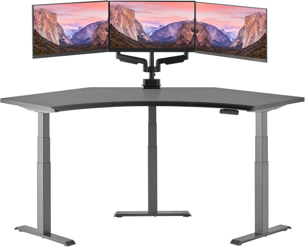 Vari Command Center Electric Standing Desk – 120° Curved Sit-Stand Gaming Desk Corner Workstation for Triple Monitors + Sloped Front Edge, 4 Height Settings, 200 lb Capacity (Black Top/Slate Legs)