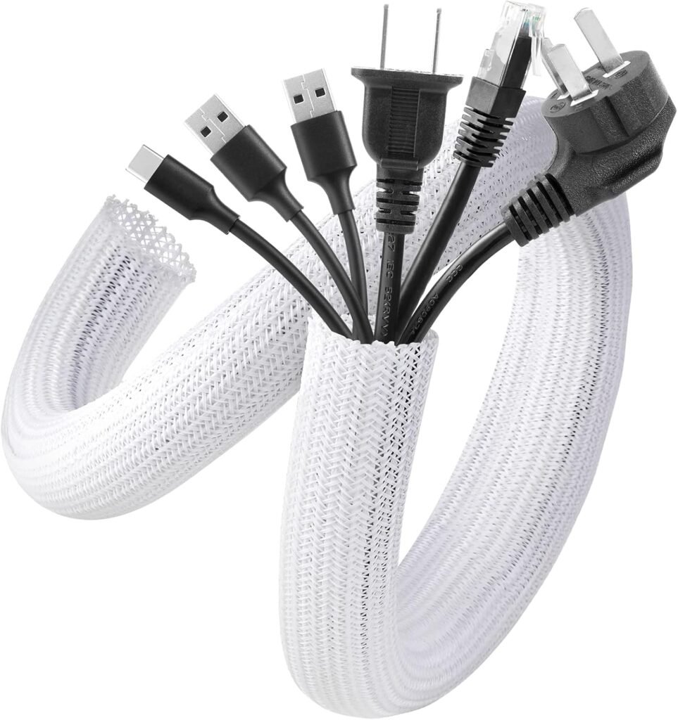 AGPTEK White Cable Sleeve Cover, 2 Pack 5ft – 1.2 inch Desk Cord Organizer Cable Hider, Home Office Wire Management Computer TV Wire Loom Tubing, Pet Proof Cord Protector, from Cat Dog Chewing, White