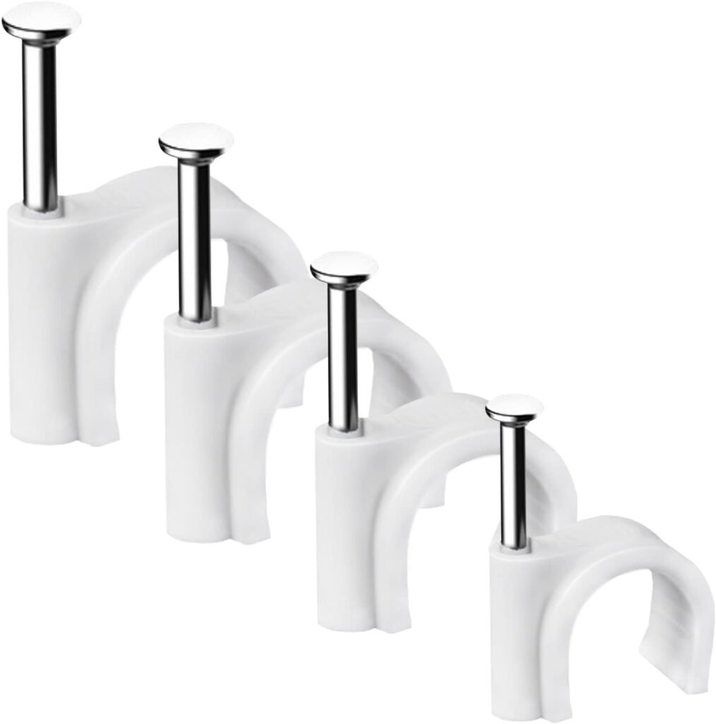 Cable Wire Clips – 100 Pcs White Cable Clips 8mm 10mm Wire Staples Wall Cables Management with Steel Nails Cord Holder for Wires, Ethernet, Cord Organization