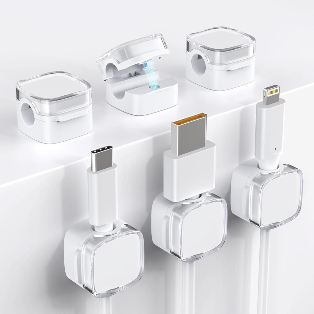 Cord Holder, 6 Pack Magnetic Cable Clips, Strong Adhesive Cord Holder for Nightstand Desk Organizer Kitchen Appliances Car Wall Office Phone Wire Keeper, Clear White