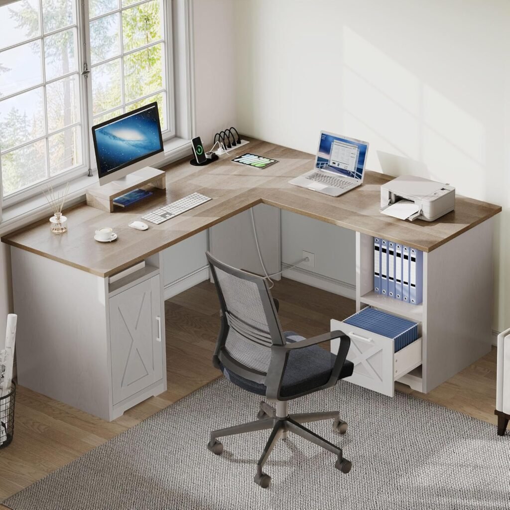 DWVO L Shaped Desk with File Drawer, 60″ Corner Computer Desk with Power Outlets, Home Office Desk with Monitor Stand & Storage Shelves & File Cabinet, Grey Wash