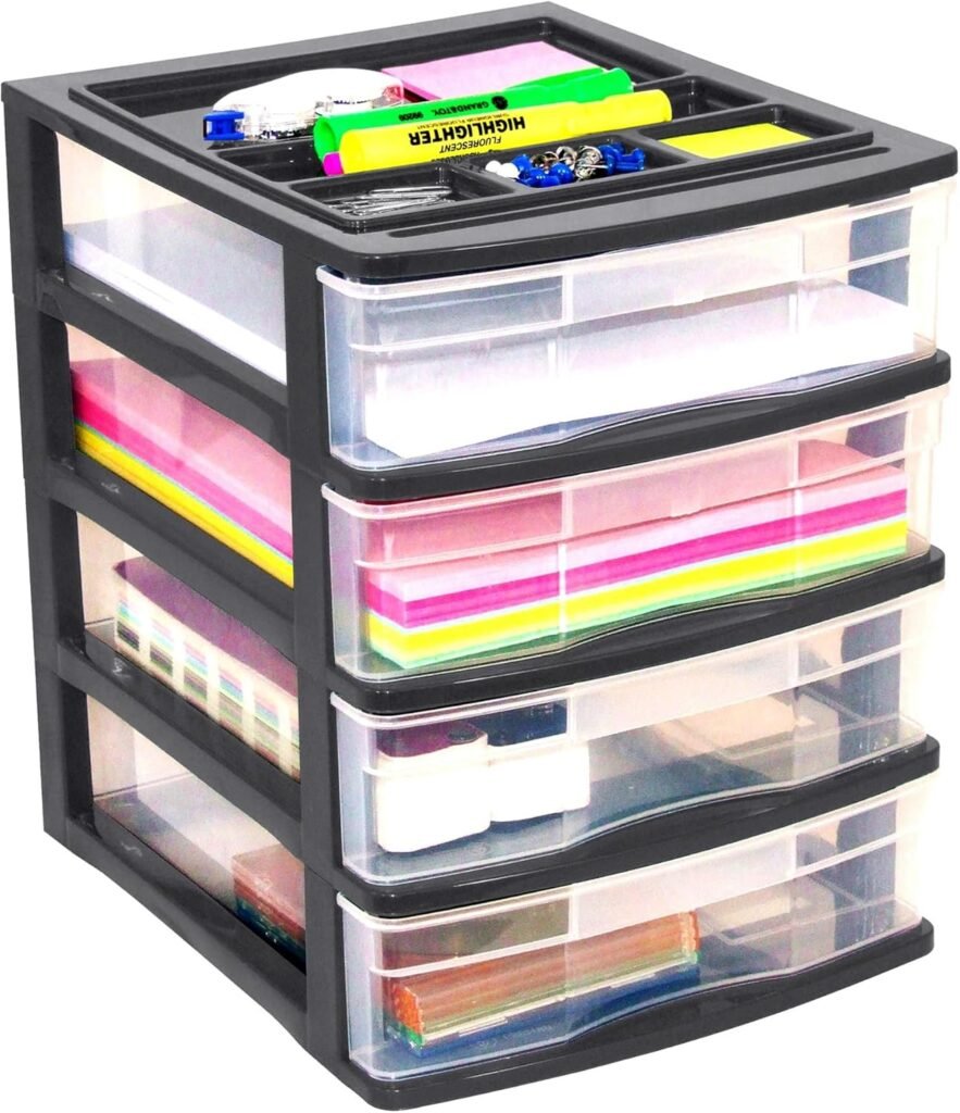 IRIS USA Small 3-Drawer Desktop Organizer, 4 Pack, Stackable, for Office, School, Stationary, Makeup Organizer, Bathroom, Utility, Medical Supplies, Desk Organizer, Versatile Storage, Black