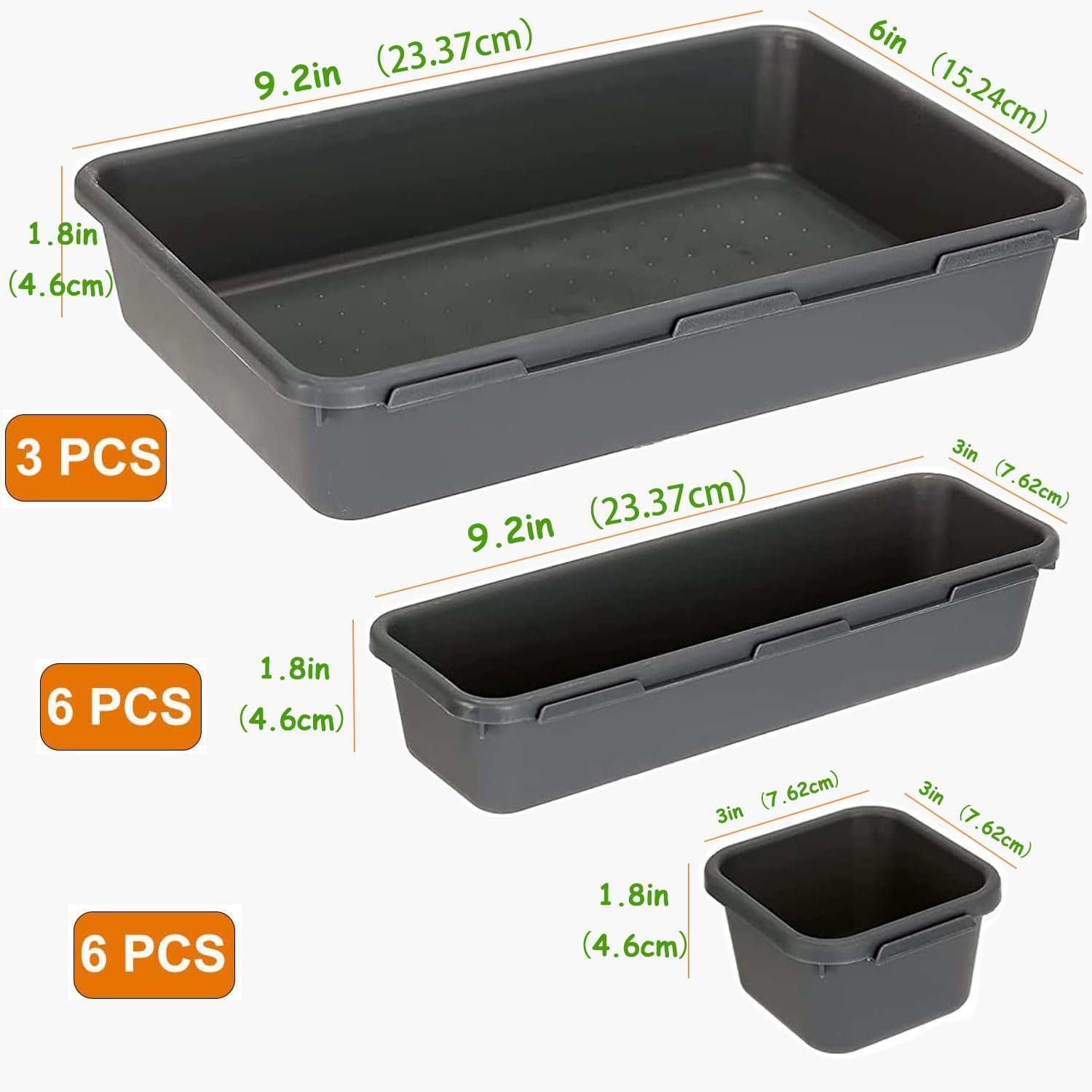 【STACKABLE】The organizer trays can be stacked together when not use, or each one works alone.Set includes:3 Pack *( 9.2 L x 6 W x 1.8 H in), 6 Pack* ( 9.2 L x 3 W x 1.8 H in), 6 Pack* ( 3 L x 3 W x 1.8 H in)