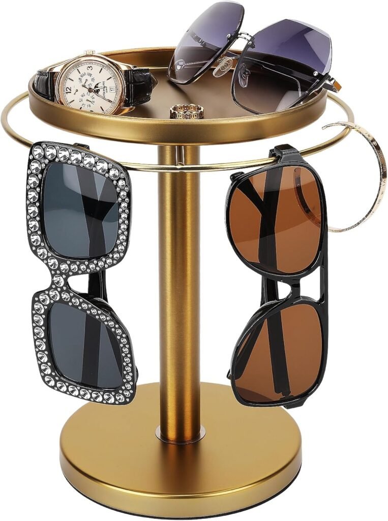 360° Rotating Sunglass Organizer Storage, Stainless Steel Glasses Holder Stand, Glasses Organizer with Tray for Desk, Dresser, Tabletop, Nightstand and Home Decor (Gold)