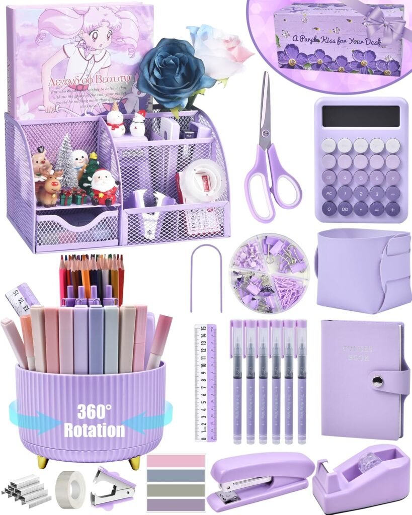 21Pcs Purple Desk Organizers and Accessories With Mesh Desk Organizer and 360°Rotating Pen Holder and a Lot of Office Purple Office Supplies Beautifully Presented in a Gift Box